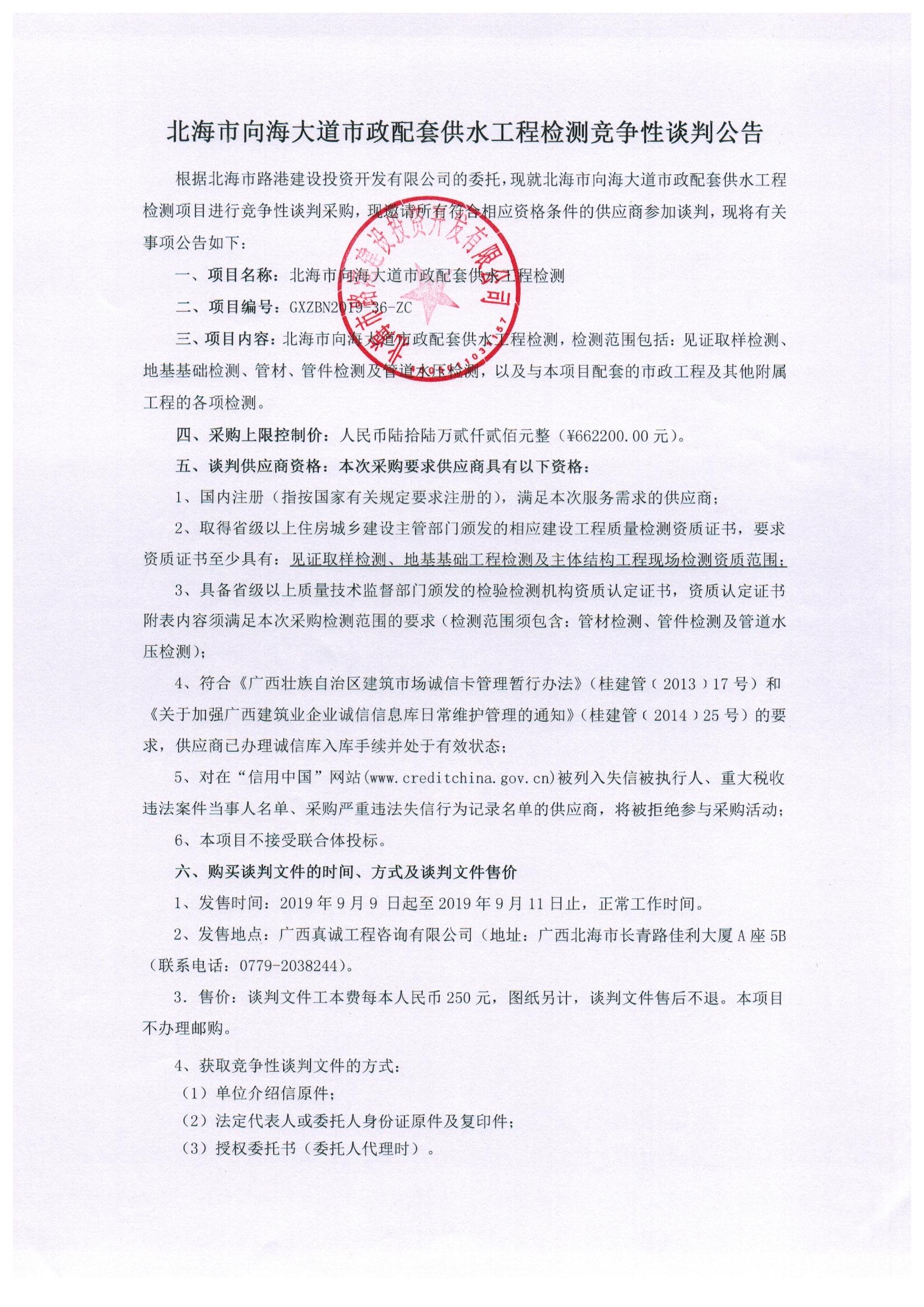 北海市向海大道市政配套供水工程檢測競爭性談判公告